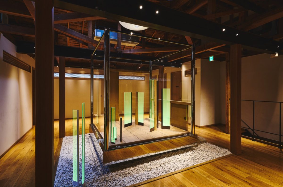 日東堂の空間に佇む、ガラスや和紙、鉄、木、鏡といった